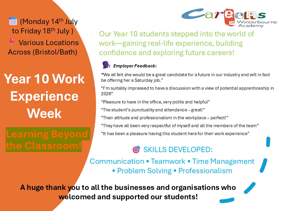 Our last Year 10 work experience week was Monday 14th July - Friday 18th July 2025. Here's our update: